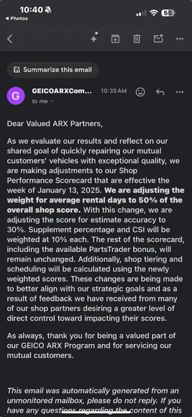 In only January of 2025 – GEICO’s (DRP) Shops had their “Scorecards” adjusted that 50% of their favorable rating is based on their cycle time. That means the faster the shop fixes the car, the more favored they become and the more work they are supplied by GEICO. 30% of their scorecard was weighted for Estimate Accuracy, 10% based on Customer Satisfaction and the other 10% based on cost-containment practices such as parts usage and material costs (assumed).